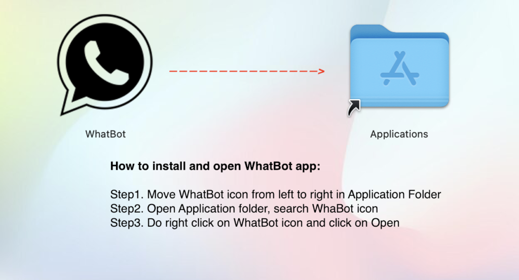 On Mac, to install and open the program you need to copy WhatBot into Application folder. Then do right click on WhatBot icon (in Application folder) and select Open.