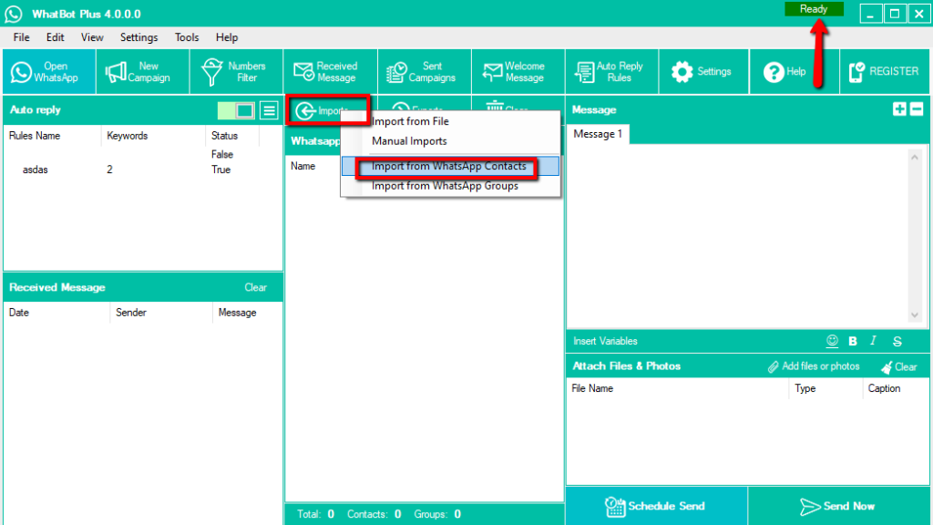 To configure the program, the only thing to do is press the Open WhatsApp button and on the screen that appears, scan the QR code (via the WhatsApp app on your phone). Once the scan is done, the green wording READY will appear at the top right of the program and you will be ready to use all the program’s functions.