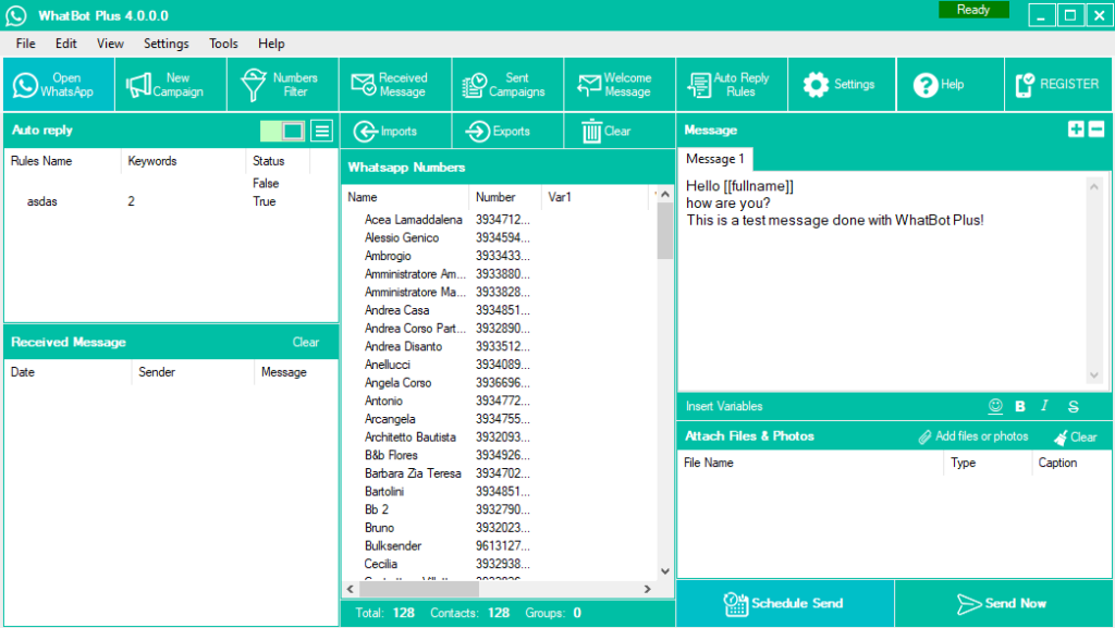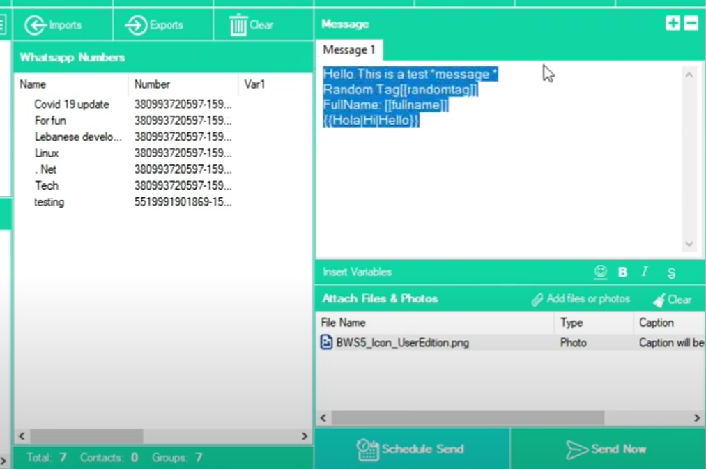 Of course, you can also attach a photo, video or file (document) to send to all users at the same time. Finally, to send the message immediately (and in BULK mode), click on SEND NOW. Alternatively you can schedule the sending at a certain time of the day (but you need to leave the program open if you want it to work).