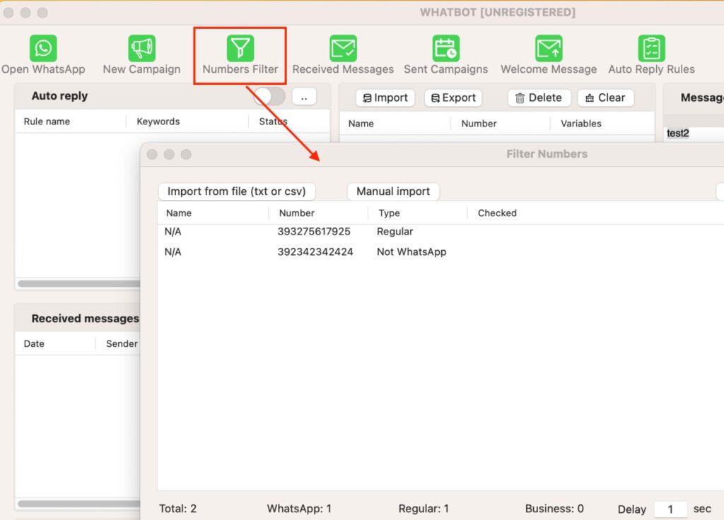 There is also a similar WhatsApp number filter function on the Mac version of WhatBot: