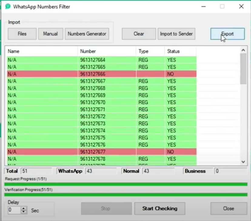 After that you import phone numbers to check, click on START CHECKING button and the program will start to filter. In red you will see non-Whatsapp phone number. In green you will see valid Whatsapp phone numbers.