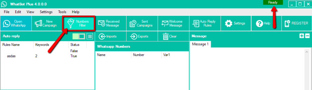 To use this function you must first click on OPEN WHATSAPP and scan the QR code. Once the green READY writing appears at the top right of the program, click on NUMBER FILTER and a window will open where you can import the numbers to be verified.