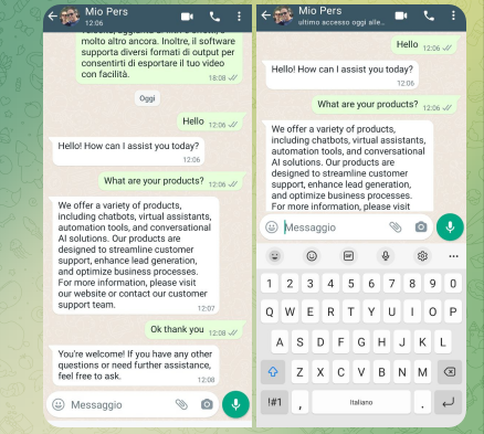 For example, when the customer sends a message to your WhatsApp account for the first time, the system responds with a welcome message and then brings up a menu with the possible info that can be received (for example by sending command n. 1 the user will be able to receive the offers in progress, by sending the command n.2 he will be able to receive info about your company, and so on).