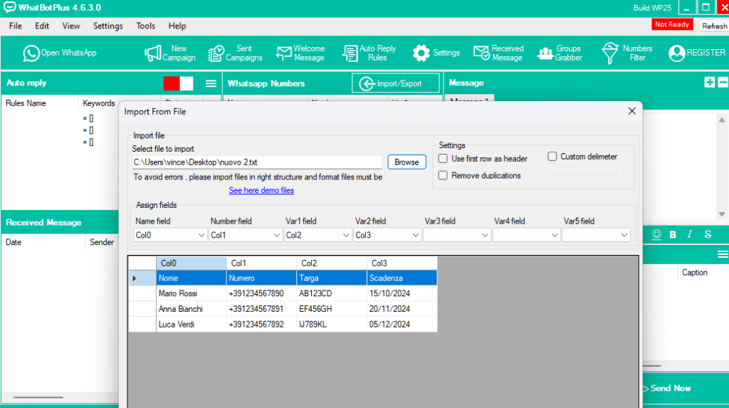 - Make sure the fields are correctly mapped. Ensure that the “Phone Number” column is matched with the phone numbers and that fields like “Name,” “License Plate,” and “Insurance Expiry Date” are also recognized by the program.